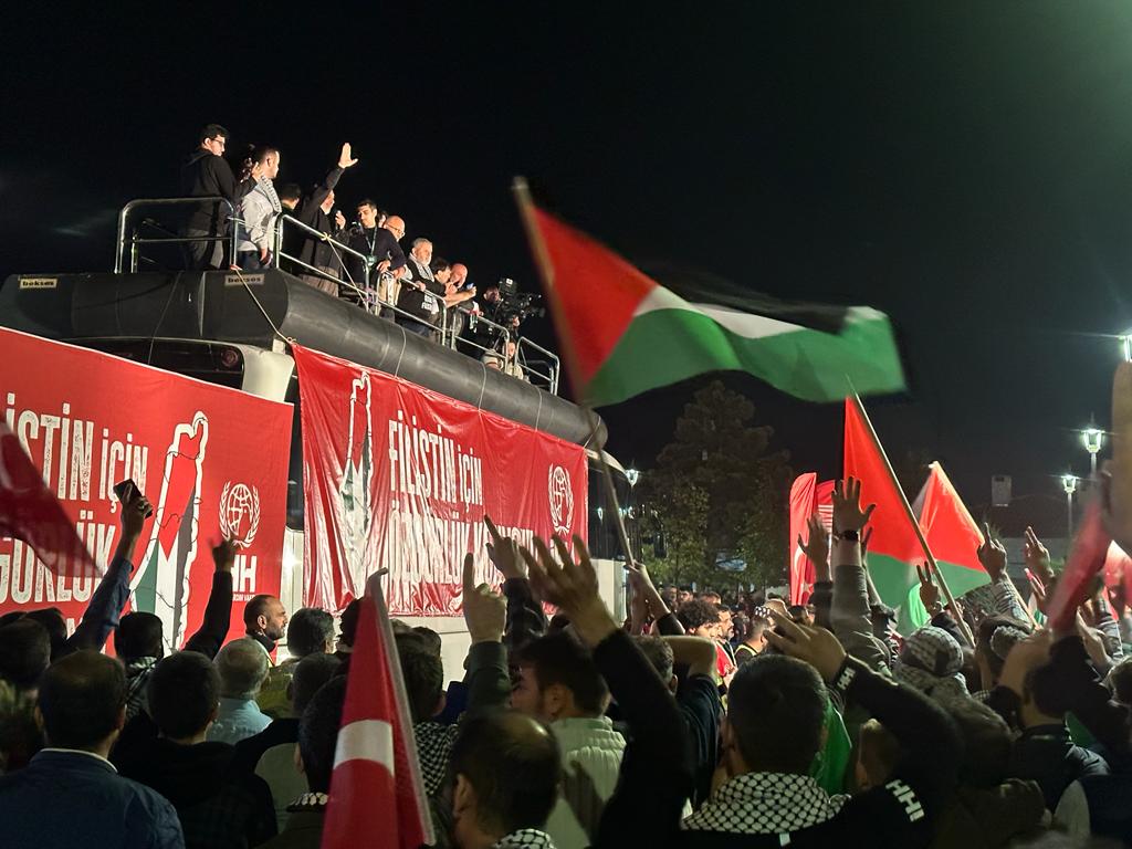 Filistin için, mazlum ve mağdur kardeşlerimiz için; insanlığın, vicdanın kalbi bugün Konya'da atıyor. Ellerimizi ve gönüllerimizi Filistinli kardeşlerimize dua için semaya açıyoruz. Konya'da 81 ilimizden gelen ve İsrail'in zulmüne lanet okuyan ve fütursuzca gerçekleştirilen saldırıların durdurulması için tüm dünyaya bir kez daha Filistinli mazlumların yanında olduğumuzu haykırdık. " dedi.